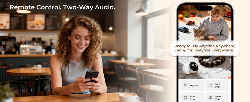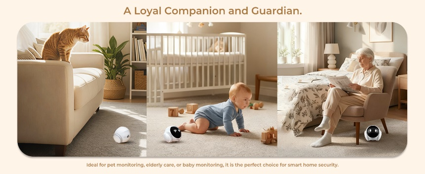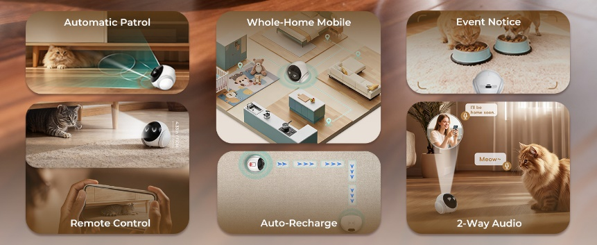 作为面向全球市场的逗宠专属智能设备,Magic S1 构建了覆盖 “安全防护 + 情感陪伴 + 智能交互” 的全场景能力,其产品定位精准击中现代家庭的核心诉求。在安全监控层面,产品支持 7x24 小时不间断录像,通过人形侦测、宠物侦测等智能识别功能,实时捕捉家庭动态并触发事件告警,让用户无论身处何地都能掌握家中情况。针对宠物陪伴的核心需求,它具备灵活的人形跟随与宠物跟随功能,配合全屋移动能力,可全程记录宠物活动瞬间,解决了传统固定监控视角局限的痛点。